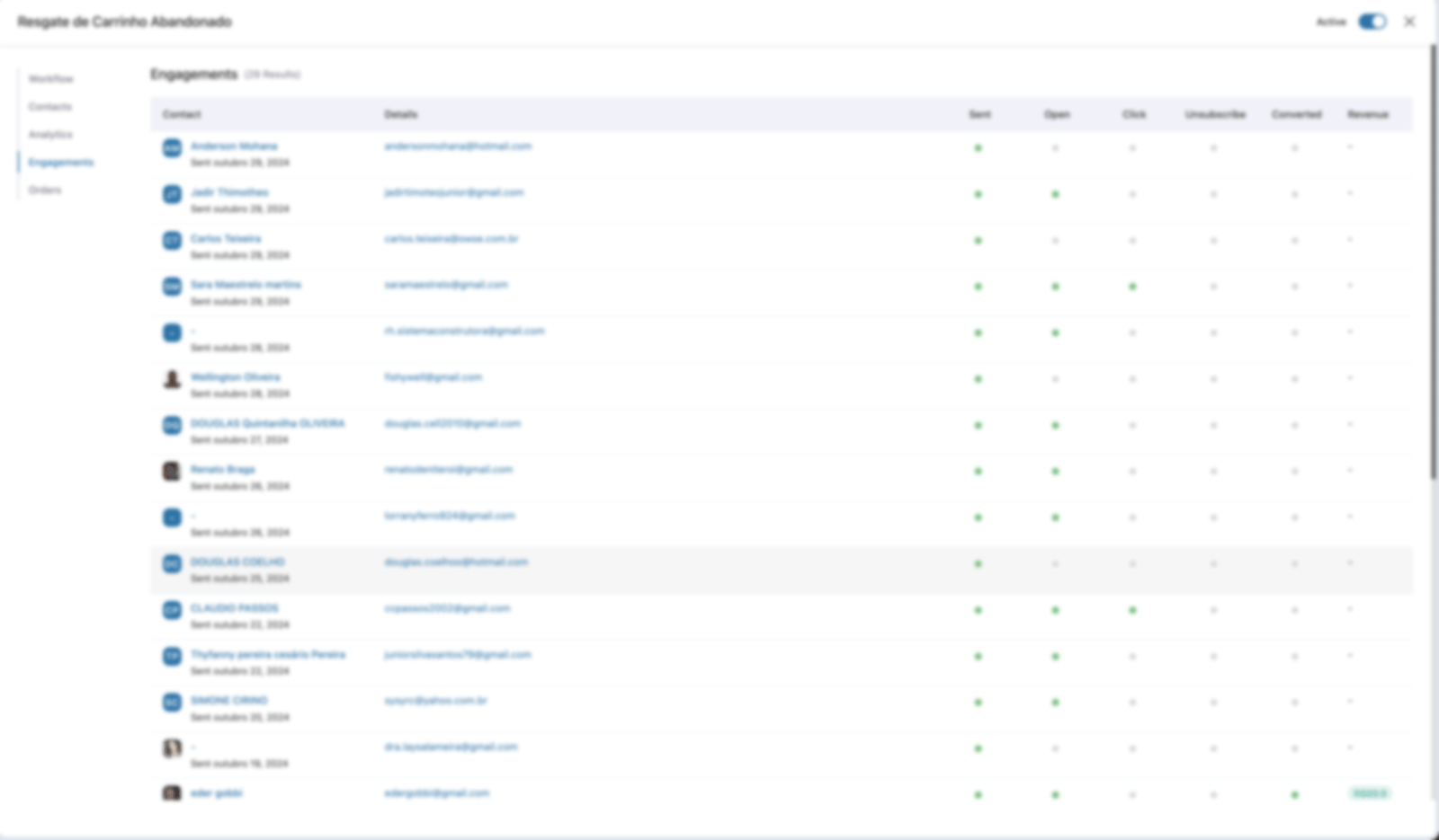 O Expnd CHK conta com um fluxo automatizado para reengajar clientes que abandonaram o checkout. Caso o cliente interrompa o processo antes da finalização, o sistema envia lembretes personalizados para incentivá-lo a retomar a compra